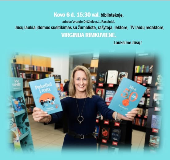 Kovo 6 dieną 15.30 valandą Raseinių Marcelijaus Martinaičio viešojoje bibliotekoje vyks susitikimas su žurnaliste, rašytoja ir lektore Virginija Rimkuviene. Autorė gerai žinoma ne tik kaip televizijos laidų redaktorė, bet ir kaip feisbuko grupės „Man 50. Ir aš dar gyva“ įkūrėja bei administratorė, subūrusi tūkstančius moterų atviriems pokalbiams apie gyvenimą brandžiame amžiuje.