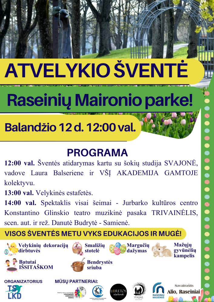 Balandžio 12 dieną, 12 valandą, Raseinių Maironio parke vyks Atvelykio šventė, kviečianti visus miestiečius ir svečius praleisti laiką kartu, dalyvauti veiklose ir pasinerti į pavasarišką šurmulį.