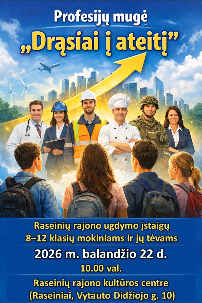 Raseinių rajono švietimo pagalbos tarnyba kviečia jaunimą ir visus, dar ieškančius savo profesinio kelio, į profesijų mugę „Drąsiai į ateitį“. Renginys skirtas ne tik 8–12 klasių mokiniams ir jų tėvams, bet ir buvusiems abiturientams, jaunuoliams bei visiems, svarstantiems apie studijas ar profesinę kryptį.