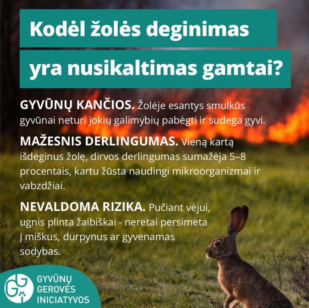 „Gyvūnai, esantys žolėje neturi jokių galimybių pabėgti ir sudega gyvi. Tai tiesiog milžiniška žala gyvajai gamtai. Ugnis nesirenka, sudega viskas, kas gyva, lieka didžiuliai išdegę plotai. Padegėjams taikomos baudos už administracinius pažeidimus nėra tokios didelės, kad atgrasytų nuo noro deginti žolę, o laukuose esantys smulkūs gyvūnai – ežiai, pelės, kiškiai, pievų paukščiai padegėjams rūpi mažiausiai“ – teigia GGI vadovė Beatričė Vaitiekūnaitė.