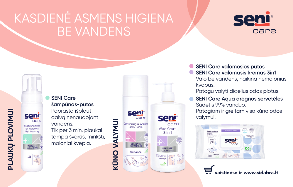 Plaukų priežiūra taip pat gali būti paprasta. Nenuplaunamu „SENI Care“ šampūnu plaukus galima ištrinkti greitai ir patogiai, nekeliant papildomo streso nei ligoniui, nei slaugančiajam. Kasdienėje priežiūroje itin praverčia ir vandens pagrindo „SENI Care Aqua“ drėgnos servetėlės, tinkamos greitai nuvalyti rankas, veidą ar net jautrią akių zoną. Ši priemonė visada turi būti po ranka, kai reikia nuvalyti bet kokius nešvarumus.